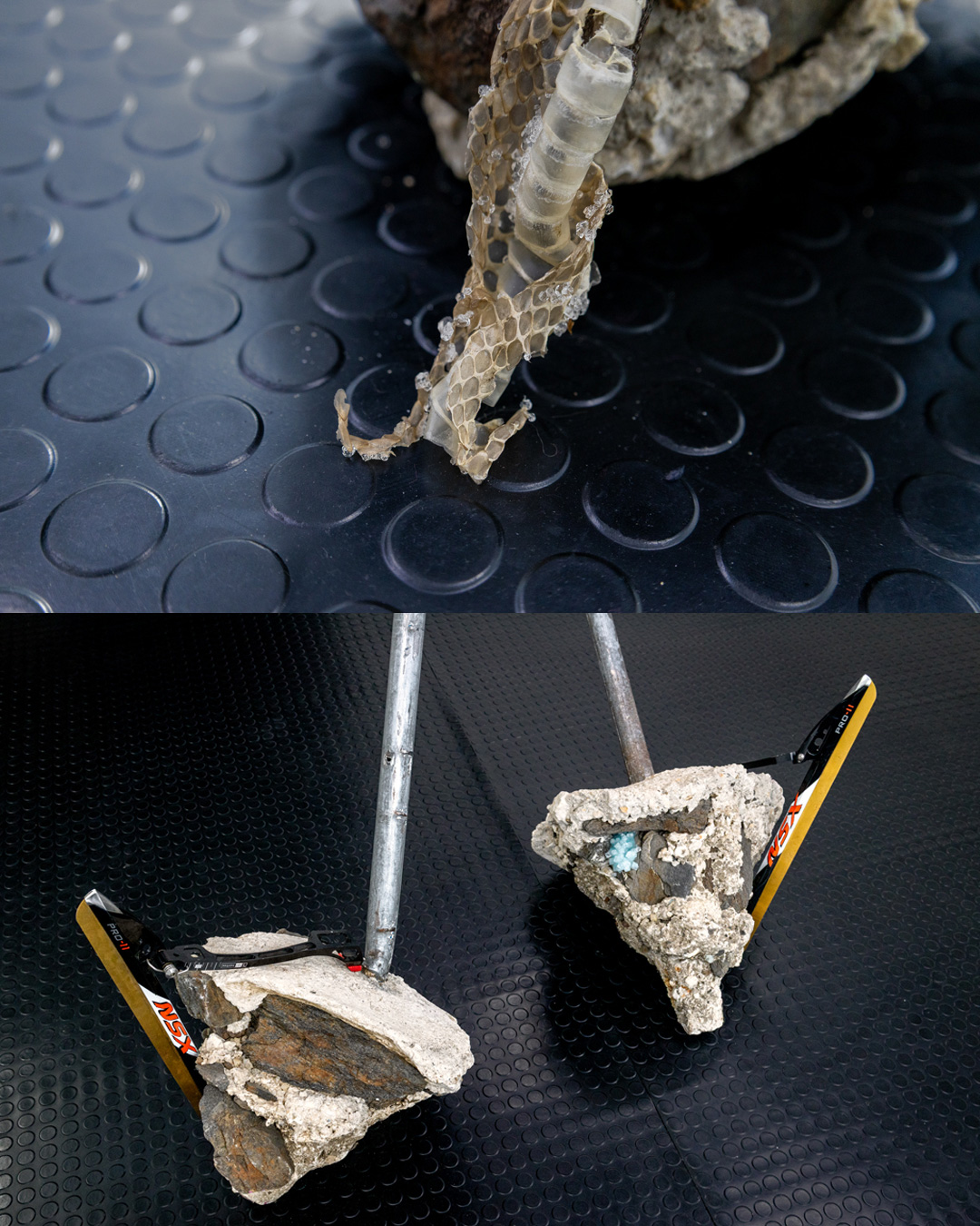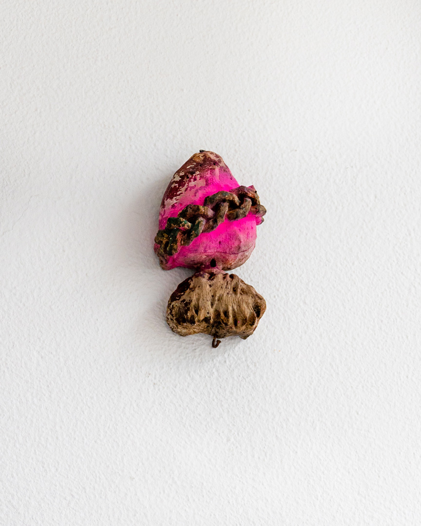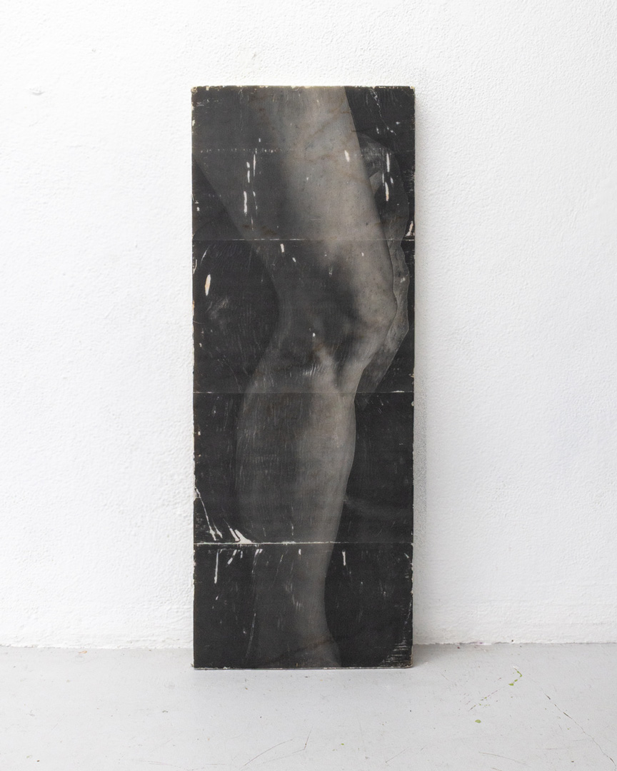 Respondendo à mesma complexidade destas relações, as ideias materializam-se de diferentes formas, criando narrativas não lineares que procuram abrir novas leituras. Os materiais que utiliza são muitas vezes encontrados ou recuperados, sublinhando as possibilidades de existir no mundo, onde corpos invisíveis revelam o que deixam para trás, como que reflexos de nós: roupas usadas, tecidos sintéticos que replicam a textura da pele, a ecdise de uma cobra; madeiras recuperadas, metais, pedaços de mármore de uma casa devoluta e outros desperdícios da indústria.